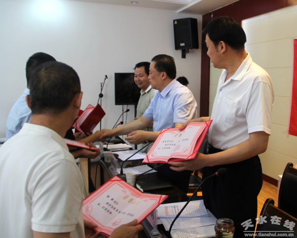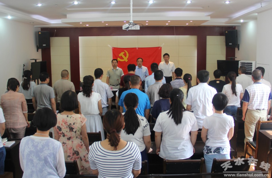 2016年 7月1日,天水市衛(wèi)生和計劃生育綜合監(jiān)督執(zhí)法局黨總支召開慶祝建黨95周年暨“七一”表彰大會。局領(lǐng)導(dǎo)班子成員、全局黨員及4名入黨積極分子,共計43人參加了會議,全體黨員高唱國歌,在鮮紅的黨旗下全體進行了宣誓,重溫入黨誓詞。會議由局黨總支委員、副局長李亞洲主持,局總支委員、副局長潘臨平同志代表黨總支作了講話。