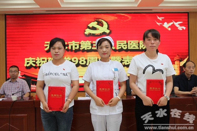6月27日下午,天水市第三人民醫(yī)院在醫(yī)院多功能會議室召開慶祝建黨98周年知識競賽暨表彰大會,共同回顧黨的光輝歷程,謳歌黨的光輝業(yè)績,弘揚黨的優(yōu)良傳統(tǒng)。院黨政領(lǐng)導(dǎo)班子成員、全體共產(chǎn)黨員及職工代表參加會議。