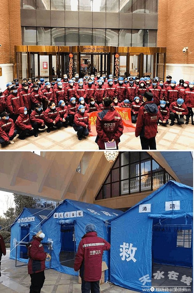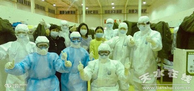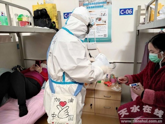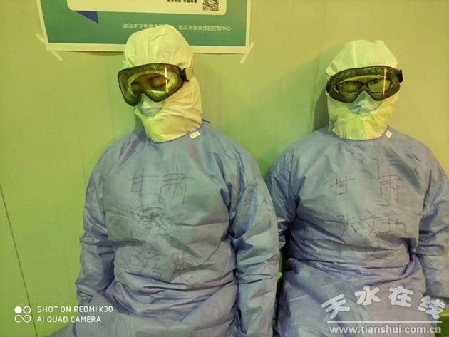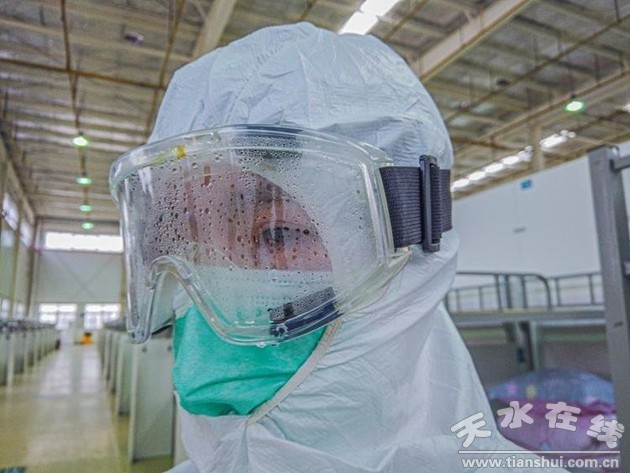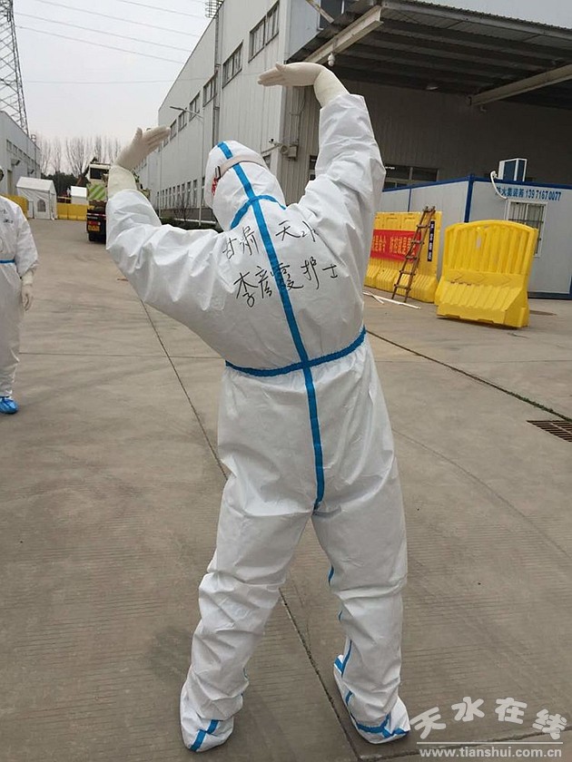 大約40分鐘路程,下午四點(diǎn)左右就到了“戰(zhàn)場(chǎng)”——武漢開(kāi)發(fā)區(qū)沌口方艙醫(yī)院,大家迅速穿齊防護(hù)裝備相互檢查,因?yàn)榇┝朔雷o(hù)服我們都不認(rèn)識(shí)誰(shuí)是誰(shuí)了,就在背后寫(xiě)了:甘肅,天水,姓名,醫(yī)護(hù),加油等字樣,確保無(wú)誤后進(jìn)入了艙內(nèi)。