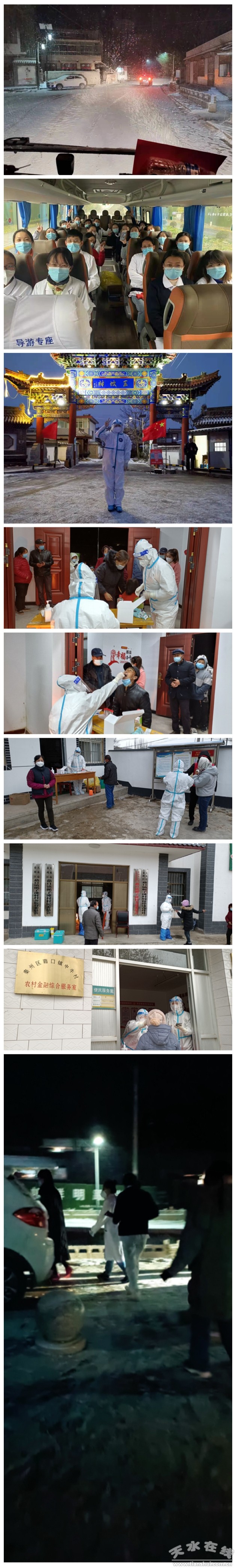 11月6日,寒潮來襲,氣溫驟降,采樣隊迎難而上,冒著風雪,克服雪天路滑、嚴寒低溫、路途遙遠等帶來的工作不便,在完成既定任務的同時,聽從秦州區(qū)統(tǒng)一調(diào)派,深入藉口鎮(zhèn)、平南鎮(zhèn)、天水鎮(zhèn)協(xié)助采樣工作。面對等待采樣的群眾,他們早已將嚴寒、疲憊拋之腦后,鉚足了勁戰(zhàn)斗著。工作結(jié)束后,采樣人員防護服上早已結(jié)出了薄薄的冰層,一雙雙紅腫的手仿佛訴說著嚴寒的肆虐。但這絲毫不影響訓練有素、堅韌進取和勇于擔當?shù)氖袐D保院核酸采樣隊,我們的白衣戰(zhàn)士不懼艱苦,順利完成了采樣任務。