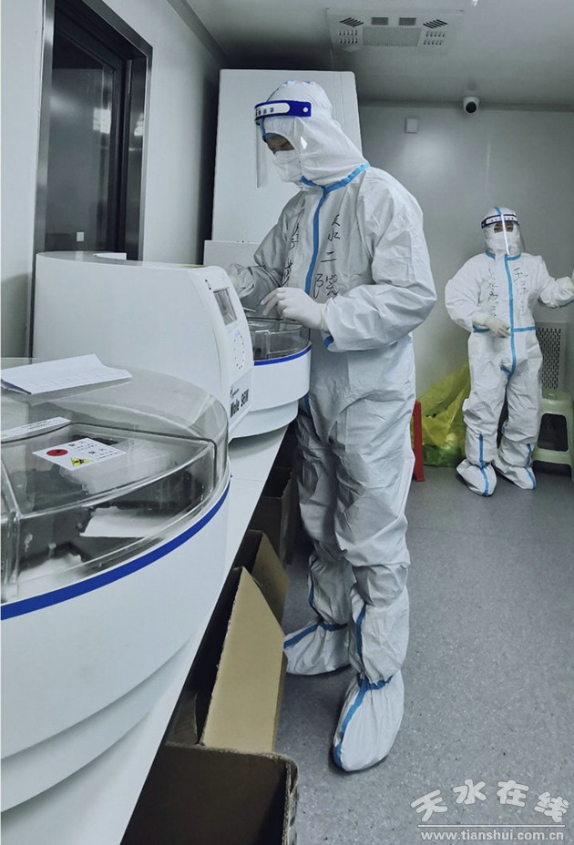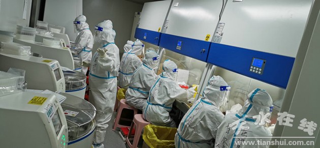 “為黨徽爭光、為黨旗添彩是我們每一位共產(chǎn)黨員的神圣使命,疫情當(dāng)前唯有奮戰(zhàn)。我們牢記院領(lǐng)導(dǎo)的囑托與信任,帶著全院1400多名職工的期盼,不負重托、不辱使命,全力以赴助力蘭州打好打贏疫情防控攻堅戰(zhàn)。”支援隊員王泰康說道。檢測過程中的每一個環(huán)節(jié)都要求他們精力高度集中,每天重復(fù)著2000多次的開蓋、擰蓋、加樣……,高強度的工作讓他們感到體力不支,但他們毫無怨言,只希望加快速度、提高效率、早出結(jié)果。