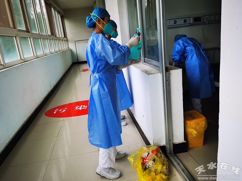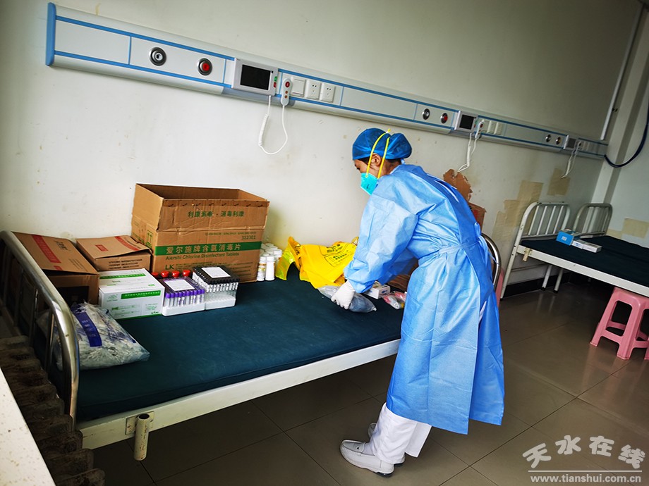 從熟悉病區(qū)環(huán)境、演練工作流程、請領(lǐng)整理物資、擦拭消毒病區(qū),到人員排兵布陣,隊員們自到達的那刻起,自發(fā)自覺的投入到需要的崗位上、角落里;衛(wèi)生間、病床、板凳、床頭桌、門窗、開關(guān)、地面等不漏一處,仔細(xì)清潔消毒;消毒濕巾、手消液、消毒劑、噴壺、拖把、采樣拭子、采血管等病區(qū)用物一一按位按需擺放整齊;3個小時的時間在隊員們的指縫中劃過,在額間耳畔、后背處滲出的汗水中淌過,伴隨著隊長發(fā)布的8點接收病人入住的指令,留給他們的時間僅剩2小時了。