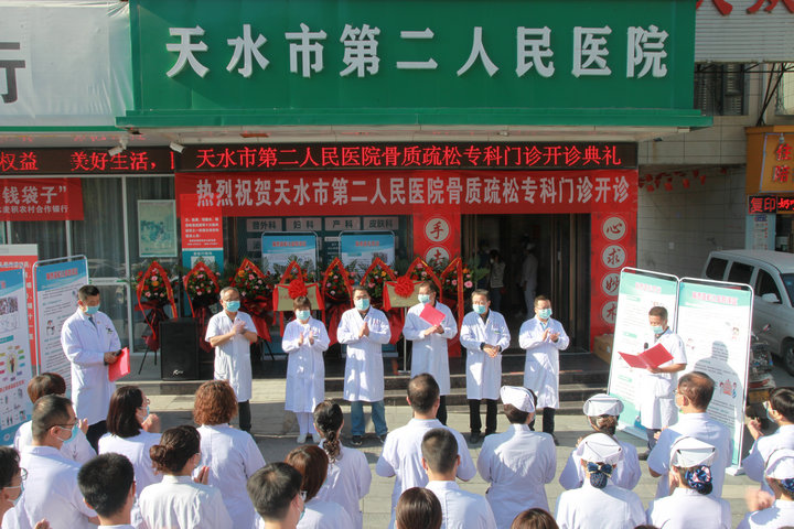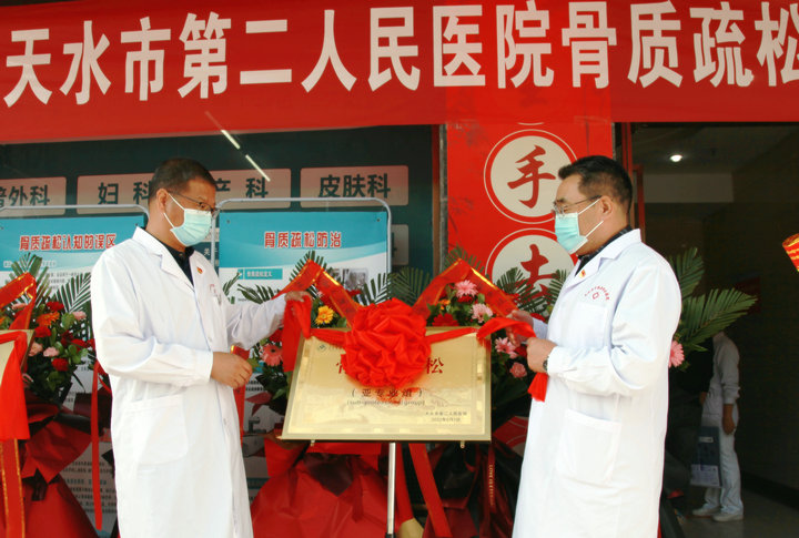 9月1日上午,天水市第二人民醫(yī)院在門診二區(qū)門口舉行骨質(zhì)疏松(亞專業(yè)組)成立、骨質(zhì)疏松?崎T診揭牌儀式。開診儀式由副院長高國明主持。院班子成員和科主任、護(hù)士長及部分臨床醫(yī)護(hù)人員參加。