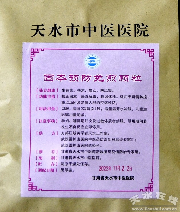 天水市中醫(yī)醫(yī)院也積極行動(dòng),依據(jù)本院諸多省市名中醫(yī)專家優(yōu)勢(shì),在方邦江岐黃學(xué)者天水工作室供方的基礎(chǔ)上,結(jié)合天水地域氣候特征調(diào)整擬定的固本預(yù)防方劑,為天水歷次疫情防控攻堅(jiān)戰(zhàn)貢獻(xiàn)了巨大的中醫(yī)力量。自天水出現(xiàn)新冠疫情以來(lái),天水市中醫(yī)醫(yī)院已累計(jì)向一線防控人員、隔離點(diǎn)人員、醫(yī)護(hù)人員及院校師生等提供30多萬(wàn)付新冠肺炎中藥固本預(yù)防方劑。本方劑由黃芪、蒼術(shù)、貫眾、防風(fēng)等藥物組成,適用于疫情防控重點(diǎn)場(chǎng)所及易感人群的疫病預(yù)防。