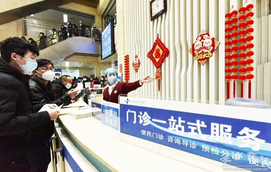 (1月31日,天水市第一人民醫(yī)院門診服務(wù)臺(tái)工作人員引導(dǎo)前來(lái)就診患者。)