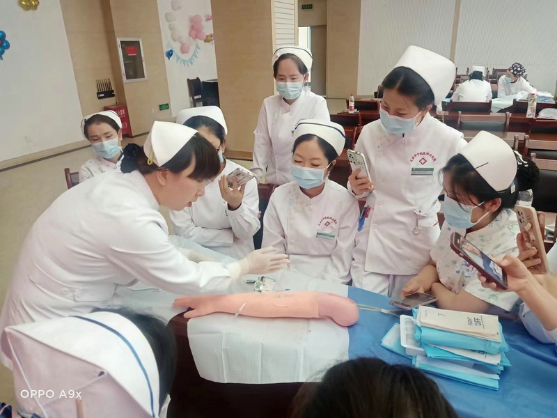 趙海蘭對(duì)第二季度靜脈治療院級(jí)質(zhì)量控制及安全管理中存在的問(wèn)題進(jìn)行了匯報(bào)。通過(guò)數(shù)據(jù)統(tǒng)計(jì),分析目前靜療現(xiàn)狀及安全隱患,規(guī)范各種輸液途徑、工具的選擇,并講解常見(jiàn)的輸液?jiǎn)栴},提出改進(jìn)方案,以達(dá)到安全輸液目標(biāo)。神經(jīng)內(nèi)科一病區(qū)和重癥醫(yī)學(xué)科靜療聯(lián)絡(luò)員以PPT形式圖文并茂地分享了藥物外滲具體案例,起到較好的警示作用。隨后,現(xiàn)場(chǎng)分組進(jìn)行PICC維護(hù)實(shí)操技術(shù),每組由專(zhuān)科護(hù)士進(jìn)行現(xiàn)場(chǎng)實(shí)操,并對(duì)PICC維護(hù)中貼膜安全撕出、消毒原則、規(guī)范固定及注意事項(xiàng)進(jìn)行講解,同時(shí)對(duì)各科靜療聯(lián)絡(luò)員進(jìn)行了PICC維護(hù)的考核。