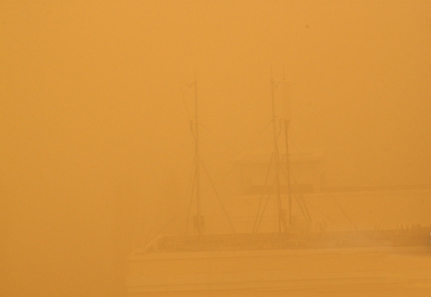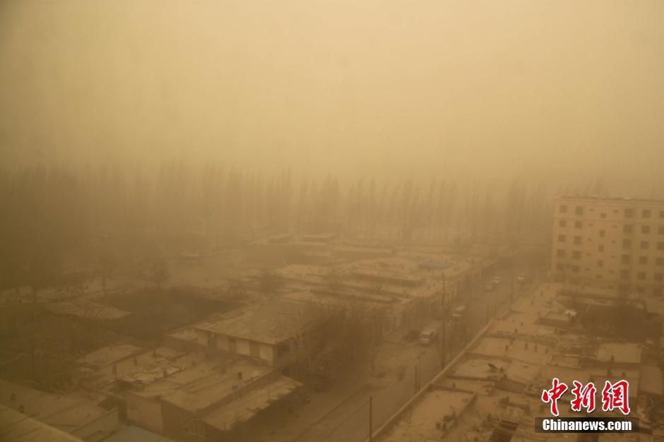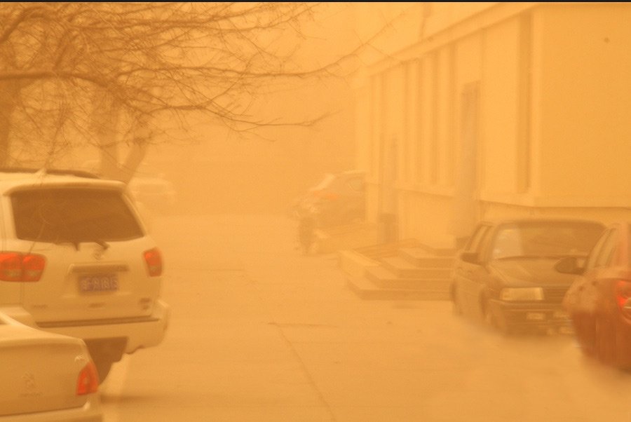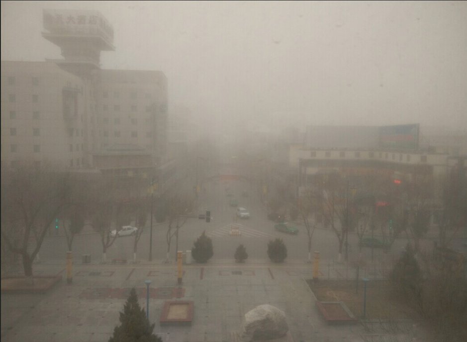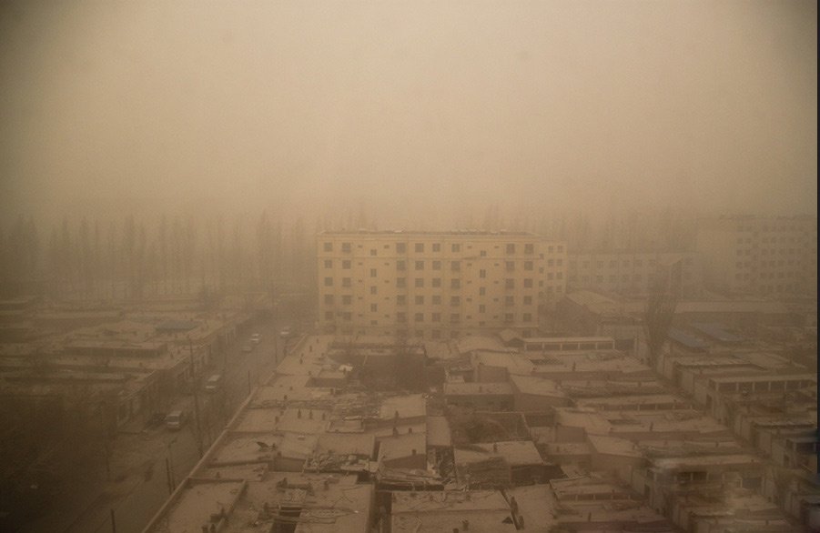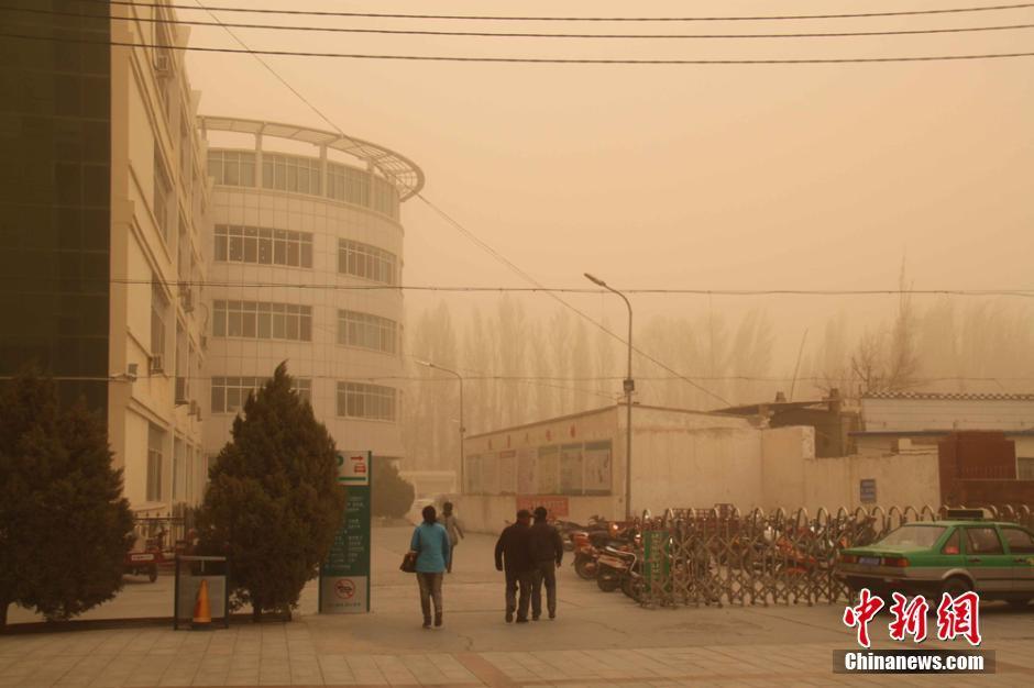 酒泉市氣象臺(tái)一位負(fù)責(zé)人當(dāng)日上午告訴記者,截至10時(shí)許,酒泉市境內(nèi)除市府肅州區(qū)外的其他地方均出現(xiàn)了不同程度的沙塵天氣,并伴隨著7級(jí)大風(fēng),瓜州縣境內(nèi)瞬時(shí)最大風(fēng)力達(dá)到9級(jí)。他建議民眾當(dāng)日待在室內(nèi),盡量減少戶外活動(dòng)。“敦煌出現(xiàn)了能見度200米的沙塵暴天氣,并且呈加重態(tài)勢(shì)!边@位負(fù)責(zé)人表示,除敦煌出現(xiàn)沙塵暴外,當(dāng)日瓜州也可能會(huì)出現(xiàn)沙塵暴天氣,“此次揚(yáng)沙天氣過(guò)程比較嚴(yán)重,目前大風(fēng)仍在持續(xù),沙塵天氣預(yù)計(jì)會(huì)維持至明天”。圖為整個(gè)城市變成了一種顏色。
