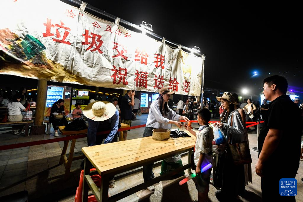 7月20日晚,在敦煌鳴沙山月牙泉景區(qū)的沙漠萬(wàn)人星空演唱會(huì)現(xiàn)場(chǎng),游客拎著垃圾向景區(qū)工作人員兌換小禮品。
