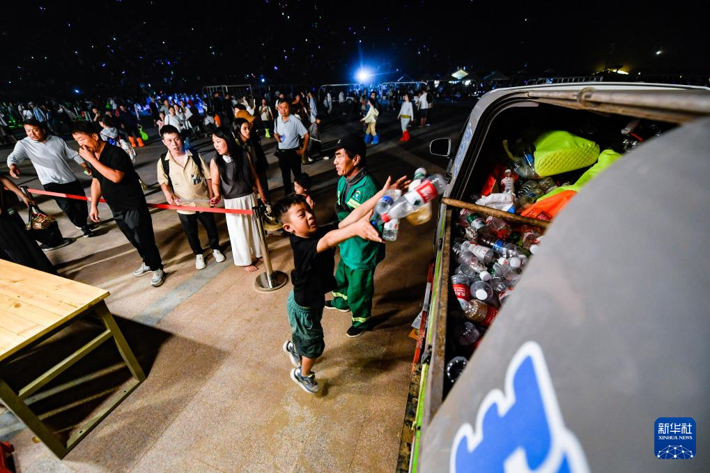 7月20日晚,在敦煌鳴沙山月牙泉景區(qū)的沙漠萬(wàn)人星空演唱會(huì)現(xiàn)場(chǎng),游客將垃圾丟進(jìn)垃圾轉(zhuǎn)運(yùn)車。