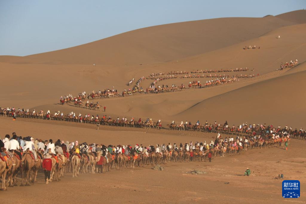 7月20日傍晚,游客在敦煌鳴沙山月牙泉景區(qū)騎駱駝。