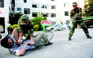 昨日,福建泉州邊防支隊官兵展示研制出的“網(wǎng)罩棍”。該武器將推廣到當(dāng)?shù)貙W(xué)校的保衛(wèi)室使用。林良標(biāo) 攝