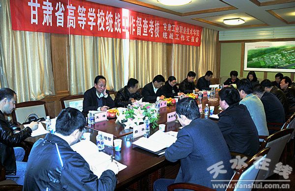 在甘肅工職學(xué)院王志年書(shū)記、郭建忠副書(shū)記等院領(lǐng)導(dǎo)的陪同下,王扎西組長(zhǎng)一行查看了學(xué)校環(huán)境,并對(duì)思想政治工作開(kāi)展情況、辦學(xué)條件等進(jìn)行了實(shí)地考察。隨后舉行了“甘肅工業(yè)職業(yè)技術(shù)學(xué)院統(tǒng)戰(zhàn)工作督查考核匯報(bào)會(huì)”,王志年書(shū)記主持會(huì)議并代表學(xué)院對(duì)王扎西書(shū)記一行的到來(lái)表示了熱烈的歡迎。院長(zhǎng)曹愛(ài)明、黨委副書(shū)記郭建忠、副院長(zhǎng)魯挑建、楊華、徐凱、李玉生等學(xué)院領(lǐng)導(dǎo)以及黨委委員、黨委辦公室主任楊建國(guó)、院長(zhǎng)助理、組織人事處處長(zhǎng)羅增智、宣傳(統(tǒng)戰(zhàn))部部長(zhǎng)周曉明、院辦主任趙新博、外事辦主任杜小平(九三學(xué)社社員,天水市政協(xié)委員)、基礎(chǔ)部數(shù)學(xué)教研室主任何彬(天水市民盟科技支部副主委)、經(jīng)管系教師王淑萍(無(wú)黨派人士代表,天水市麥積區(qū)人大代表)等參加了匯報(bào)會(huì)。