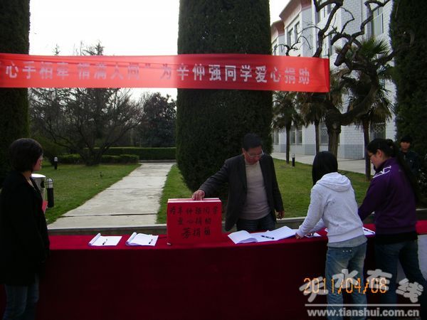 在得知辛仲?gòu)?qiáng)同學(xué)身患重病的消息后,甘肅林職學(xué)院領(lǐng)導(dǎo)、老師和同學(xué)們用不同的方式表達(dá)著自己的關(guān)懷與祝福。2011年4月8日林職學(xué)院團(tuán)委、學(xué)生處及建筑工程系聯(lián)合向全院發(fā)出了“心手相牽、情滿人間”為主題的為辛仲?gòu)?qiáng)同學(xué)愛(ài)心募捐活動(dòng),全院師生積極響應(yīng),老師、同學(xué)們紛紛伸出援助之手。在不到3個(gè)小時(shí)的時(shí)間里,就為辛仲?gòu)?qiáng)同學(xué)募捐到33717.8元,目前捐款仍在進(jìn)行中。