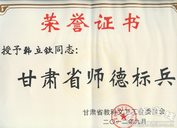 在第28個(gè)教師節(jié)即將來(lái)臨之際,為了表彰全省教育系統(tǒng)廣大教育工作者的先進(jìn)事跡,不斷深化師德建設(shè)活動(dòng),進(jìn)一步激發(fā)廣大教師的工作積極性和創(chuàng)造性,甘肅省教科文衛(wèi)工會(huì)[2012]42號(hào)文件,決定授予全省教育系統(tǒng)93名同志以及全省首屆青年教師教學(xué)技能大賽中獲獎(jiǎng)的27名同志“甘肅省師德標(biāo)兵”稱號(hào)。工職學(xué)院教師韓立欽作為教學(xué)技能大賽獲獎(jiǎng)選手之一,喜獲此項(xiàng)榮譽(yù)。