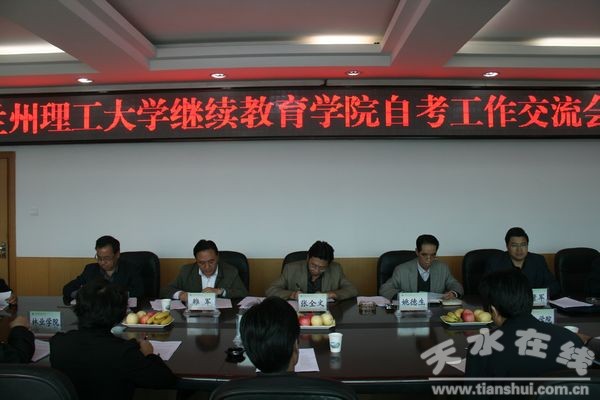 10月12日,蘭州理工大學(xué)繼續(xù)教育學(xué)院高等教育自學(xué)考試應(yīng)用型專業(yè)教學(xué)(天水片)工作交流會在甘肅林業(yè)職業(yè)技術(shù)學(xué)院召開。出席會議的有蘭州理工大學(xué)繼續(xù)教育學(xué)院院長張全文、副院長雒軍、自考部主任樊向、函授部馬貞生,以及甘肅工業(yè)職業(yè)技術(shù)學(xué)院、甘肅機(jī)電職業(yè)技術(shù)學(xué)院、天水市秦州區(qū)教師進(jìn)修學(xué)校等天水片區(qū)教學(xué)站、建筑工程系以及該院繼續(xù)教育部負(fù)責(zé)人出席了會議。會議由該院副院長姚德生教授主持。