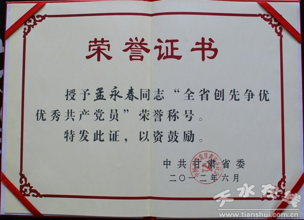 秦州區(qū)皂郊中學(xué)黨支部、麥積區(qū)教體局機(jī)關(guān)黨支部、甘谷縣第五中學(xué)黨支部和武山縣第四中學(xué)黨支部被省教育廳黨組表彰為“全省教育系統(tǒng)創(chuàng)先爭優(yōu)先進(jìn)基層黨組織”;天水市青少年學(xué)生校外活動中心張永蔚、天水市實(shí)驗(yàn)小學(xué)董軍鋒、秦安縣一中張耀清、清水縣教體局馬小平、張家川縣教體局王曉太等被評為“全省教育系統(tǒng)創(chuàng)先爭優(yōu)優(yōu)秀共產(chǎn)黨員”。此外,市教育局黨委在教育系統(tǒng)創(chuàng)先爭優(yōu)活動總結(jié)大會上還對直屬各單位的7個(gè)先進(jìn)基層黨組織、28名優(yōu)秀共產(chǎn)黨員和7名優(yōu)秀黨務(wù)工作者也進(jìn)行了表彰。