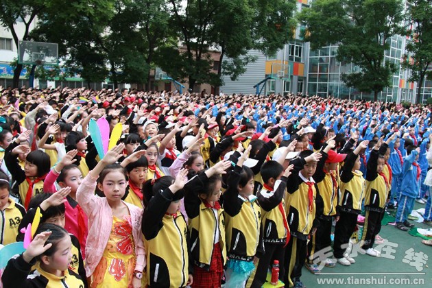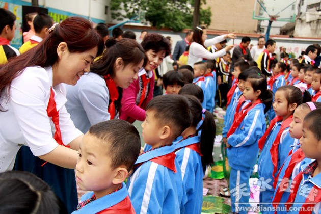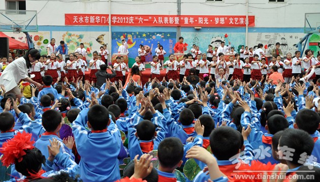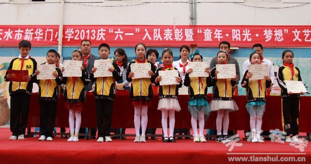 5月31日,第64個國際兒童節(jié)來臨,天水市新華門小學331名一年級兒童興高采烈地戴上了紅領巾,圖為胡校長等學校領導為新隊員親自佩戴紅領巾。這是2013年天水市新華門小學“慶六一”入隊表彰暨“童年-陽光-夢想”文藝演出現(xiàn)場,當日,學校還表彰了330名學生,16名優(yōu)秀班主任,15名優(yōu)秀老師,有15個班級被評為優(yōu)秀班集體。