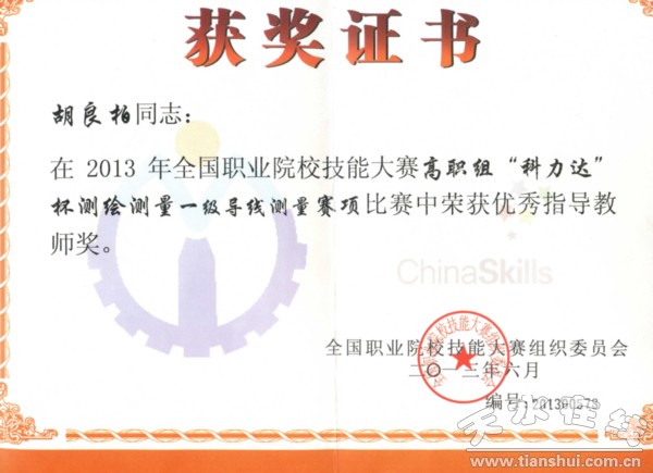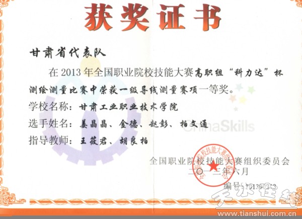 2013年全國(guó)職業(yè)院校技能大賽高職組測(cè)繪測(cè)量賽項(xiàng)于6月7日至10日在河南工業(yè)職業(yè)技術(shù)學(xué)院舉行。甘肅工業(yè)職業(yè)技術(shù)學(xué)院派出的姜晶晶、金德、趙彭、柏文通四名選手榮獲“一級(jí)導(dǎo)線測(cè)量”一等獎(jiǎng),“二等水準(zhǔn)測(cè)量”三等獎(jiǎng)。甘肅工業(yè)職業(yè)技術(shù)學(xué)院的王筱君、胡良柏兩位指導(dǎo)老師獲得由“全國(guó)職業(yè)院校技能大賽組織委員會(huì)”頒發(fā)的“優(yōu)秀老師指導(dǎo)獎(jiǎng)”。