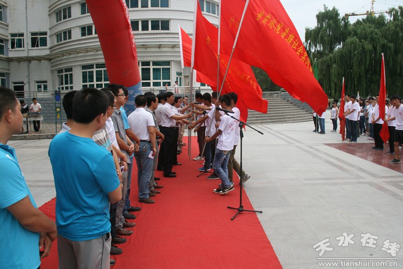 在儀式上,團(tuán)委副書記王國龍宣讀了《關(guān)于組織開展“中國夢·隴原情”暑期社會實踐活動的通知》;志愿者代表郎兵峰同學(xué)進(jìn)行了發(fā)言。