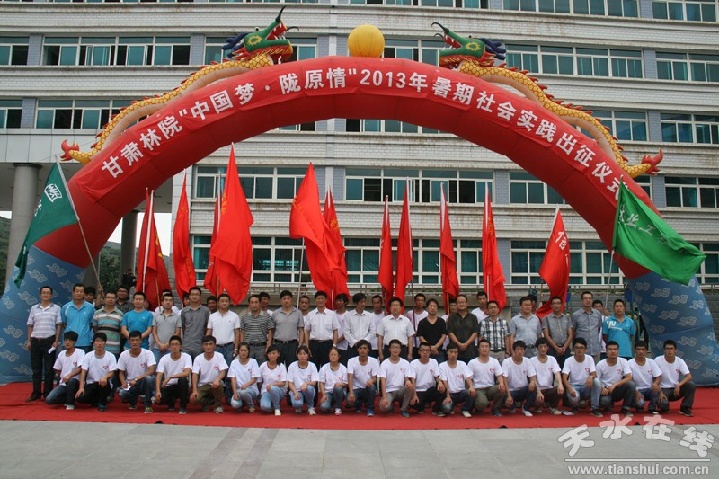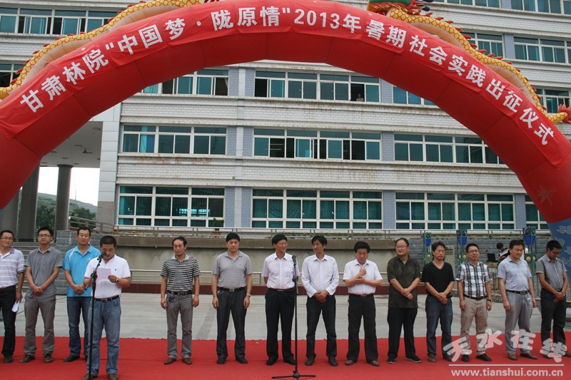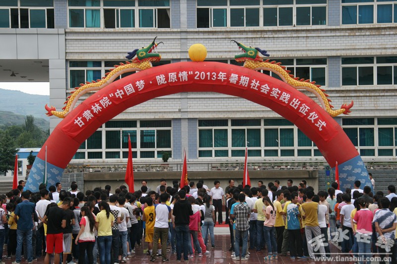 7月13日,甘肅林業(yè)職業(yè)技術(shù)學(xué)院“中國夢·隴原情”2013年暑期社會實踐活動出征儀式在學(xué)院小廣場隆重舉行。該學(xué)院副院長冉福祥及教務(wù)處、招生就業(yè)處、學(xué)生處、宣傳部、團(tuán)委等部門負(fù)責(zé)人及有關(guān)指導(dǎo)教師、學(xué)生代表和北京林業(yè)大學(xué)志愿者共400余人出席了出征儀式。儀式由團(tuán)委書記羅龍主持。