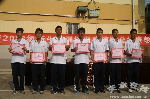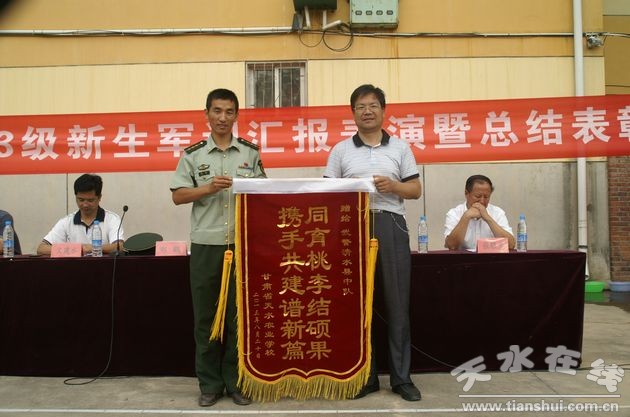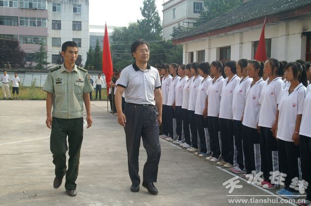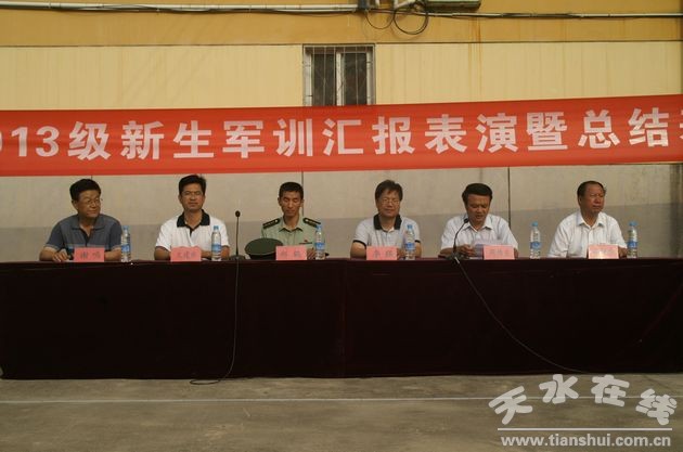 天水農(nóng)校2013級新生軍訓(xùn)從8月12日開始,經(jīng)過九天的緊張訓(xùn)練,于8月20日順利結(jié)束,上午八點(diǎn)半舉行了軍訓(xùn)匯報表演暨總結(jié)大會。校長李強(qiáng),副校長周偉東、文建水,學(xué)校黨委副書記張銀虎,紀(jì)檢書記謝鳴,武警清水縣中隊(duì)教官,學(xué)校各科室負(fù)責(zé)人和全體班主任、助理班主任參加了大會。大會由副校長周偉東主持。