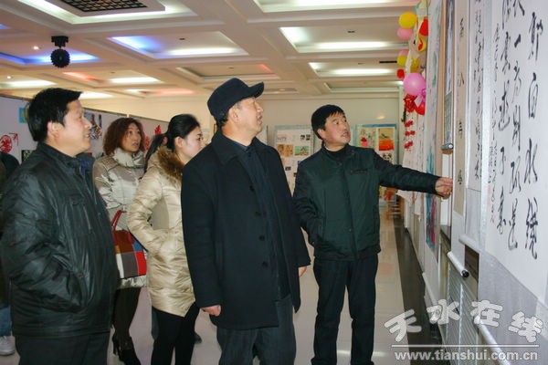 匯報會之前,街道辦事處領導在學生活動中心觀看了學院第三屆“秋實杯”書畫攝影展。