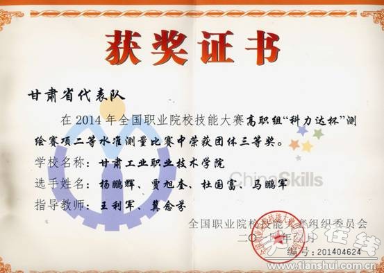 本次競(jìng)賽項(xiàng)目共有3項(xiàng),經(jīng)過(guò)緊張、激烈的角逐,該校派出的楊鵬輝、賈旭奎、杜國(guó)富、馬鵬軍四名選手榮獲“二等水準(zhǔn)測(cè)量”團(tuán)體三等獎(jiǎng),每位參賽選手同時(shí)獲得由國(guó)家測(cè)繪局技能鑒定中心頒發(fā)的 “工程測(cè)量員”中級(jí)職業(yè)資格證。