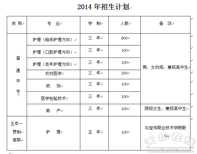 學(xué),F(xiàn)有三個辦學(xué)層次。開設(shè)的普通中專專業(yè)有護理、助產(chǎn)、藥劑、農(nóng)村醫(yī)學(xué)、醫(yī)學(xué)檢驗技術(shù)等;從2011年開始,學(xué)校與寶雞職業(yè)技術(shù)學(xué)院聯(lián)合開辦五年一貫制高職護理班;與蘭州大學(xué)、甘肅中醫(yī)學(xué)院繼續(xù)教育學(xué)院及西安交通大學(xué)網(wǎng)絡(luò)教育學(xué)院等高校聯(lián)合開辦臨床醫(yī)學(xué)、護理、檢驗、中醫(yī)學(xué)、藥學(xué)等專業(yè)成人醫(yī)學(xué)教育。