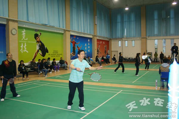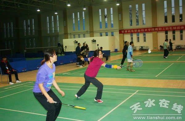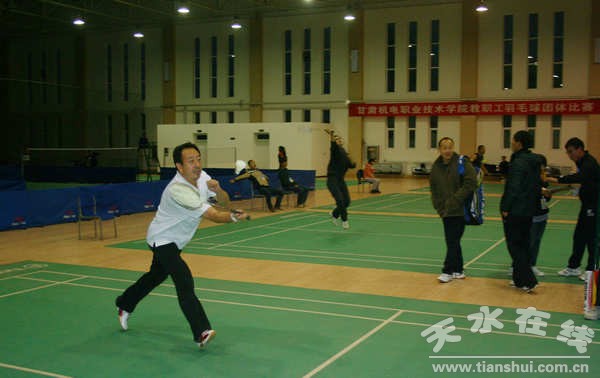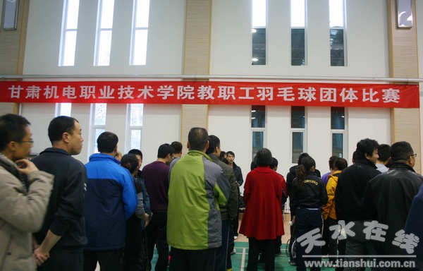 甘肅機(jī)電職業(yè)技術(shù)學(xué)院2014年教職工羽毛球團(tuán)體比賽于11月24日下午在體育館正式開賽,校黨委書記李宗義為比賽開球,黨委副書記、副院長(zhǎng)王芳弟致詞。