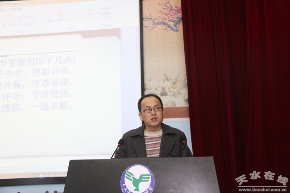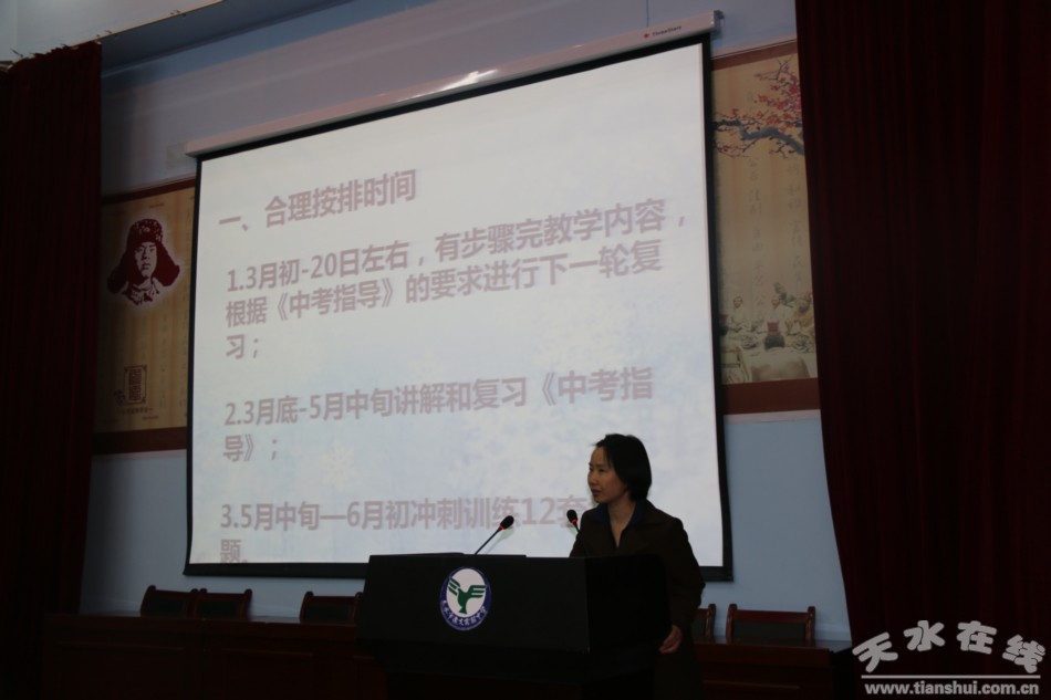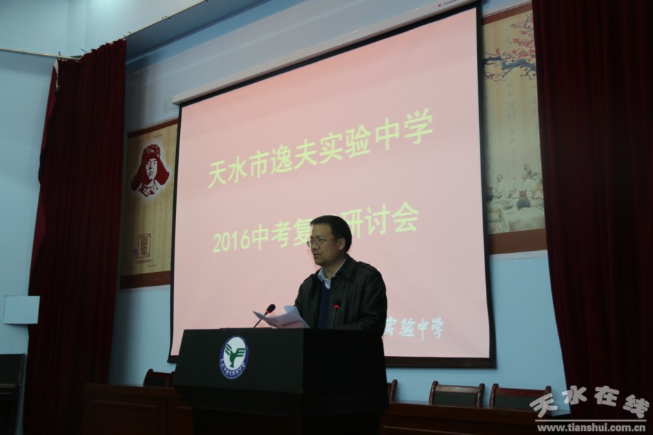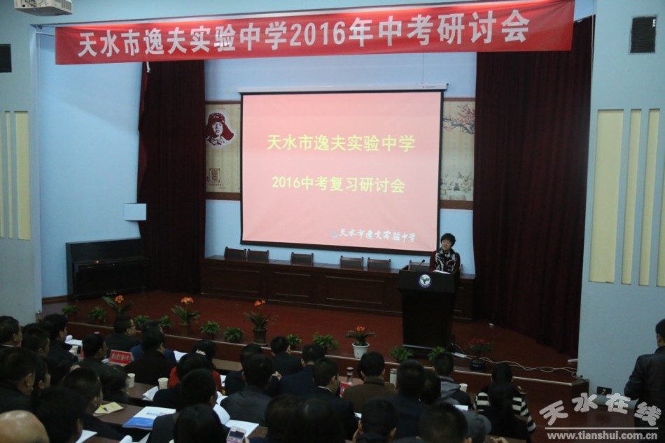 3月12日上午,天水市逸夫?qū)嶒炛袑W階梯教室內(nèi)掌聲陣陣,氣氛熱烈。2016年中考教學和復習研討活動正在這里成功舉行。來自全市六縣區(qū)十四所學校及市逸夫?qū)嶒炛袑W九年級全體老師共300多人匯聚一堂,共話中考策略。