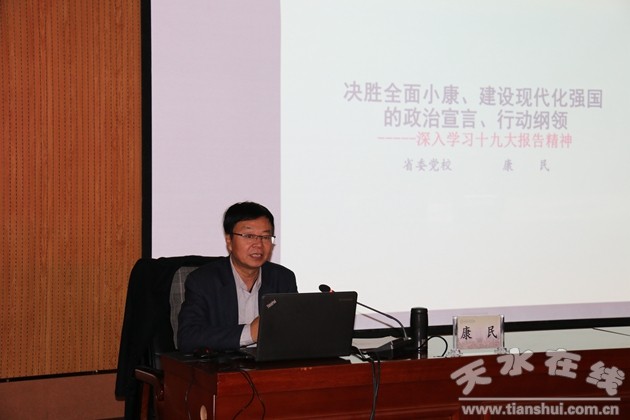 會上,康民作了題為《決勝全面小康、建設(shè)現(xiàn)代化強(qiáng)國的政治宣言和行動綱領(lǐng)》宣講報(bào)告,他緊扣黨的十九大報(bào)告思想脈絡(luò),從“需要把握的新論點(diǎn)、明確發(fā)展的一系列戰(zhàn)略部署、抓住黨的建設(shè)新要求”等三個(gè)方面,旁征博引、深入淺出,全面、準(zhǔn)確、系統(tǒng)闡述了黨的十九大提出的新論斷、新思想、新部署、新要求。