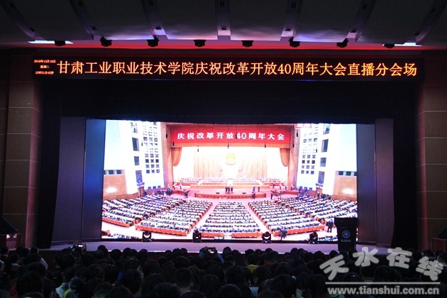 根據(jù)省教育廳統(tǒng)一安排,甘肅工業(yè)職業(yè)技術學院組織師生在大學生活動中心集中收看慶祝改革開放40周年大會直播,改校領導楊聲、曹愛明、郭建忠、魯挑建、李玉生與師生代表共800余人一同收看。各二級學院組織師生在不同地方同步收看。