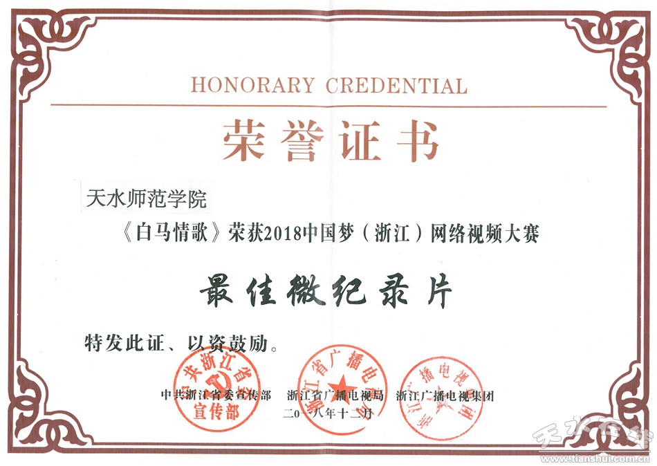 12月21日,2018中國夢(mèng)(浙江)網(wǎng)絡(luò)視頻大賽頒獎(jiǎng)典禮在浙江國際影視中心舉行,天水師院文學(xué)與文化傳播學(xué)院師生拍攝的紀(jì)錄片《白馬情歌》獲得最佳紀(jì)錄片獎(jiǎng)。