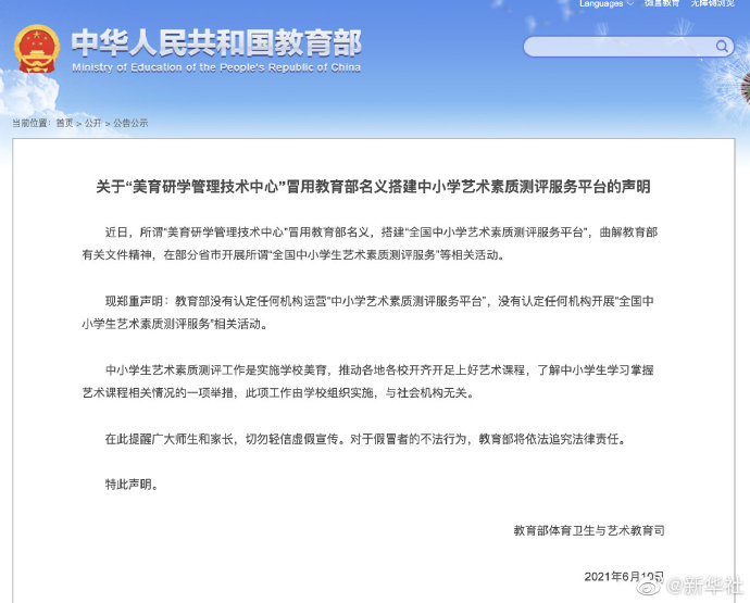 教育部10日發(fā)布聲明稱,近日,所謂“美育研學(xué)管理技術(shù)中心”冒用教育部名義,曲解教育部有關(guān)文件精神,在部分省市開展所謂“全國中小學(xué)生藝術(shù)素質(zhì)測評服務(wù)”等相關(guān)活動。教育部聲明表示,教育部沒有認定任何機構(gòu)運營“中小學(xué)藝術(shù)素質(zhì)測評服務(wù)平臺”,沒有認定任何機構(gòu)開展“全國中小學(xué)生藝術(shù)素質(zhì)測評服務(wù)”相關(guān)活動。中小學(xué)生藝術(shù)素質(zhì)測評工作由學(xué)校組織實施,與社會機構(gòu)無關(guān)。教育部提醒廣大師生和家長,切勿輕信虛假宣傳。(記者胡浩)