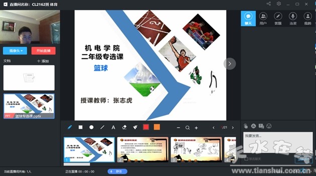 線上體育,確保思想體質(zhì)不滑坡。體育工作部教師、經(jīng)濟管理系JG2021班班主任張志虎老師采用超星泛雅平臺作為線上教學系統(tǒng)的云端大腦,他通過線上直播課程不僅給同學們講授體育技巧知識,還鼓勵同學們在有限的環(huán)境下,利用身邊可以利用的器材,強身健體,做到心理健康,身體健康。