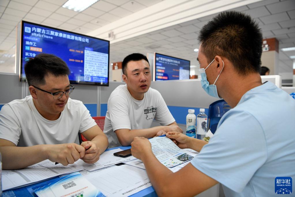 求職者(右一)在2021年寧夏銀川夏季人才招聘大會(huì)暨高校畢業(yè)就業(yè)雙選招聘會(huì)上與用人單位交流(7月24日攝)。新華社記者 馮開華 攝