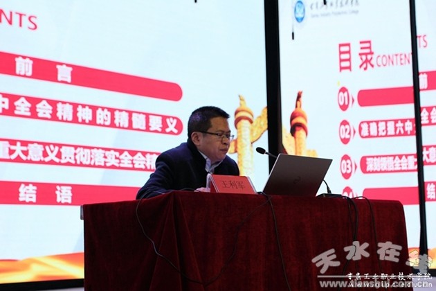 近日,甘肅工業(yè)職業(yè)技術(shù)學(xué)院副院長王利軍在大學(xué)生活動(dòng)中心為測繪學(xué)院師生作十九屆六中全會精神專題宣講。