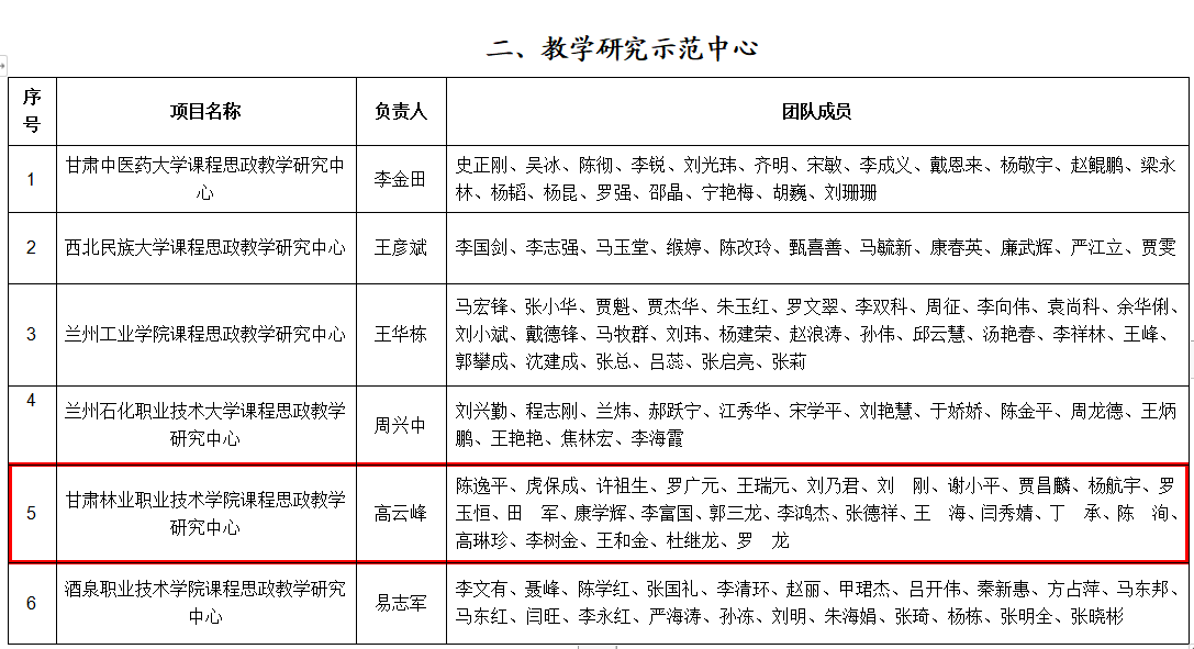 近日,甘肅省教育廳公布了2021年甘肅省高校課程思政示范項目名單,由黨委書記高云峰主持的甘肅林業(yè)職業(yè)技術(shù)學(xué)院課程思政教學(xué)研究示范中心被立項為甘肅省課程思政教學(xué)研究示范中心,由李鴻杰教授主持的林業(yè)技術(shù)課程思政示范專業(yè)被立項為甘肅省課程思政示范專業(yè),《高校環(huán)境工程專業(yè)課程思政教學(xué)改革研究與實踐》和《高職院校〈經(jīng)濟(jì)法基礎(chǔ)〉課程思政教學(xué)改革研究》項目被立項為課程思政建設(shè)研究項目。