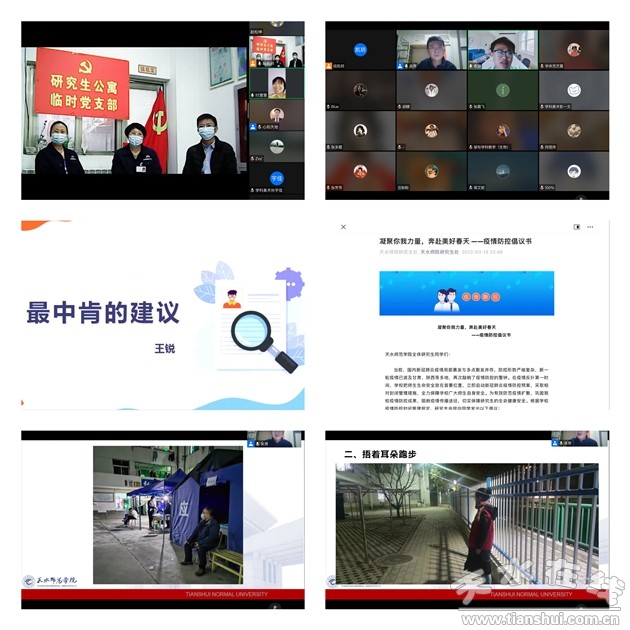 研究生公寓臨時黨支部、研究生會推陳出新,創(chuàng)新“云端”思政模式,依托 “騰訊會議”平臺,組織開展“最忙碌的身影”“最龐大的群體”“最中肯的建議”系列活動,分別邀請宿管人員、優(yōu)秀畢業(yè)生和考取博士研究生代表講述自身防疫工作故事,分享升學(xué)就業(yè)經(jīng)驗,切實做到用身邊人講身邊事,以身邊事教育身邊人。同時,利用“天水師院研究生處”公眾號定期推送的課程思政文章、最新時政熱點、學(xué)習(xí)工作經(jīng)驗等,搭建起課程思政教育“云”平臺,切實增強研究生思想政治工作的親和力與靈活性,使思想政治教育與研究生生活學(xué)習(xí)得到緊密結(jié)合。