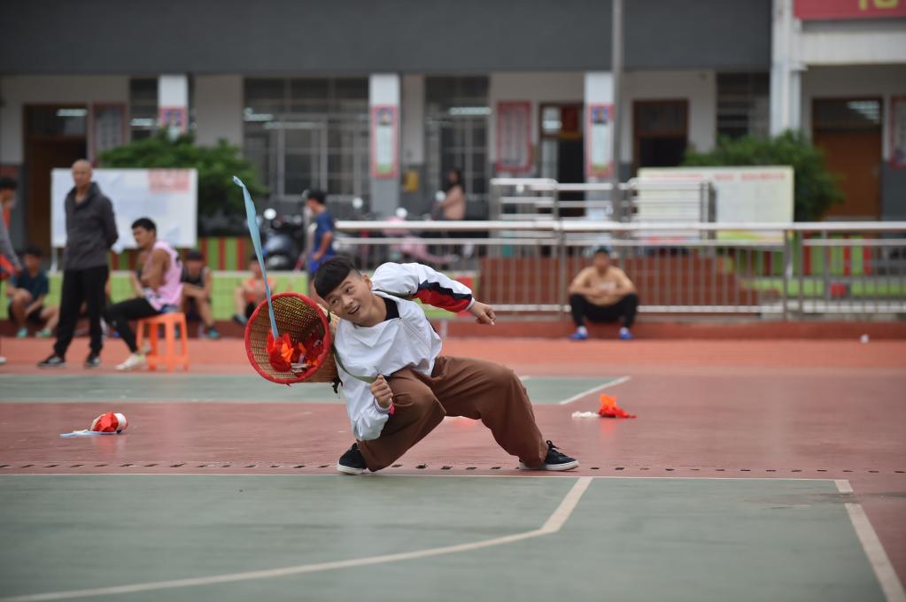 2021年11月4日,在廣西崇左大新縣民族高級中學,一名學生用背簍接繡球,通過傳統(tǒng)民族體育運動強身健體。新華社記者劉嶺逸攝