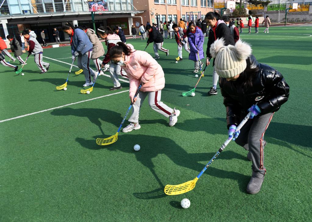 2022年1月11日,山東省青島市基隆路小學的同學們在體育課上練習旱地冰球。新華社記者李紫恒攝