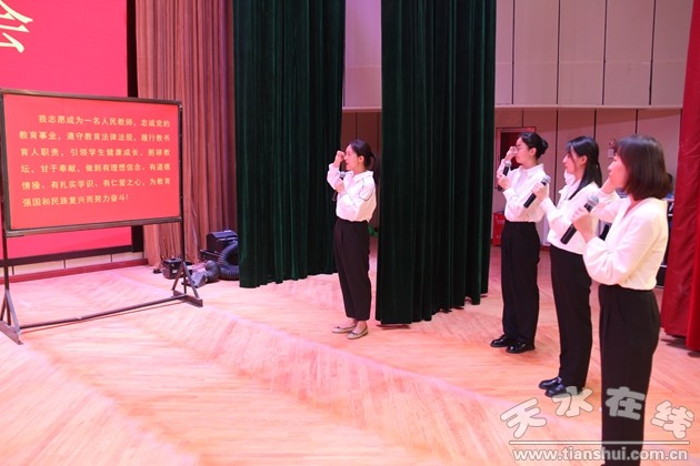 大會在莊嚴(yán)的國歌聲中拉開帷幕,舉行了新教師入職宣誓儀式。在教務(wù)科副科長王娟芳老師的領(lǐng)誓下,新入職的3名教師進行了“人民教師誓詞”入職宣誓,表達了履行人民教師神圣職責(zé),立志成為“四有”好老師的心聲。對涌現(xiàn)出的20名優(yōu)秀教師、13名優(yōu)秀班主任、8名優(yōu)秀教育工作者進行了表彰獎勵。獲獎教師代表、現(xiàn)代農(nóng)業(yè)工程學(xué)院新生代表、中職新生代表先后進行了發(fā)言。