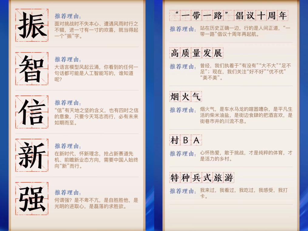 前五位年度國內(nèi)候選字為“振”“智”“信”“新”“強”,前五位年度國內(nèi)候選詞為“‘一帶一路’倡議十周年”“高質(zhì)量發(fā)展”“煙火氣”“村BA”“特種兵式旅游”;前五位年度國際候選字為“!薄靶尽薄皯(zhàn)”“談”“核”,前五位年度國際候選詞為“戰(zhàn)爭”“ChatGPT”“核污染水”“芯片”“巴以沖突”。