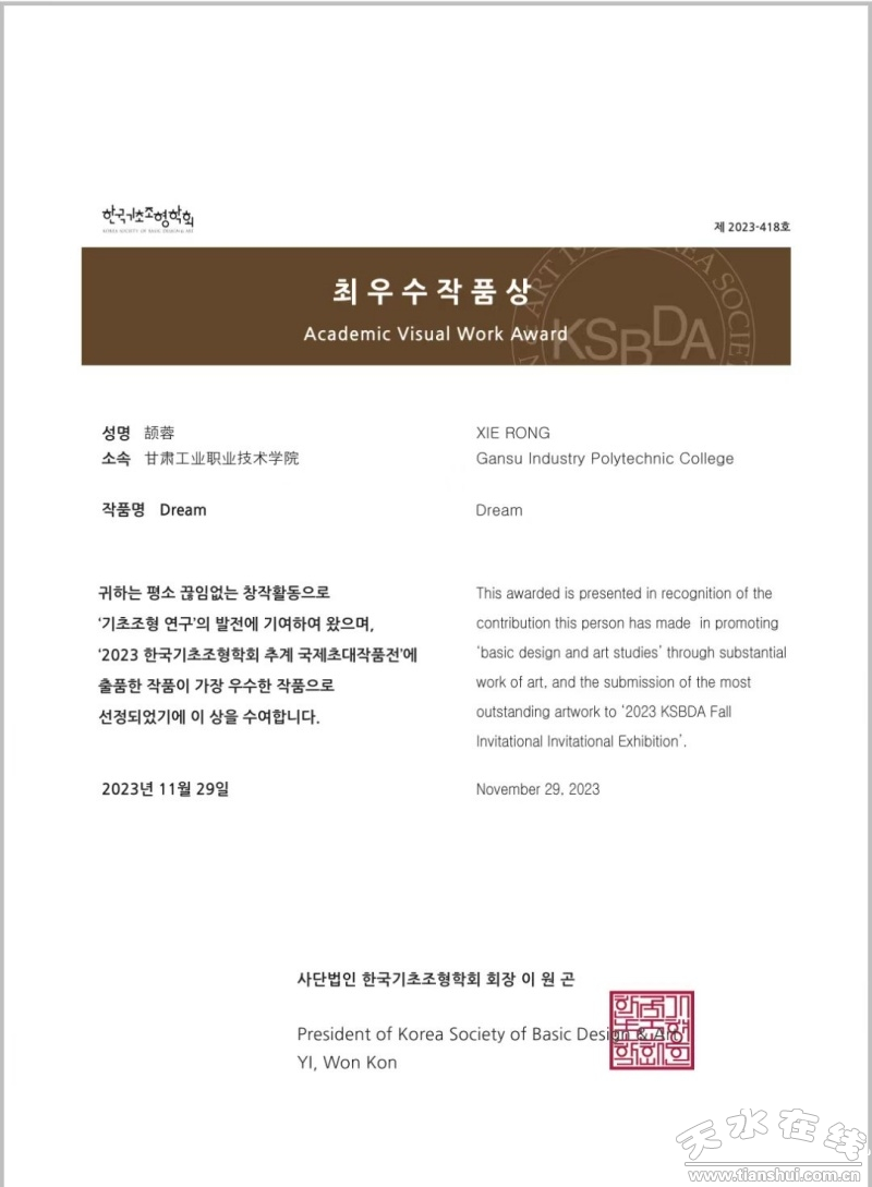 韓國基礎設計學會(KSBDA)秋季國際會議暨邀請展覽聚集了來自世界各地的藝術家和設計師,是一個展示創(chuàng)新藝術和設計的國際平臺。甘肅工業(yè)職業(yè)技術學院教師的獲獎不僅是對創(chuàng)作者藝術才華的肯定,也是學校辦學實力的體現(xiàn),更為中韓文化交流做出了重要貢獻。學校將積極鼓勵優(yōu)秀教師參加國際活動,為世界不斷呈現(xiàn)東方藝術的魅力。