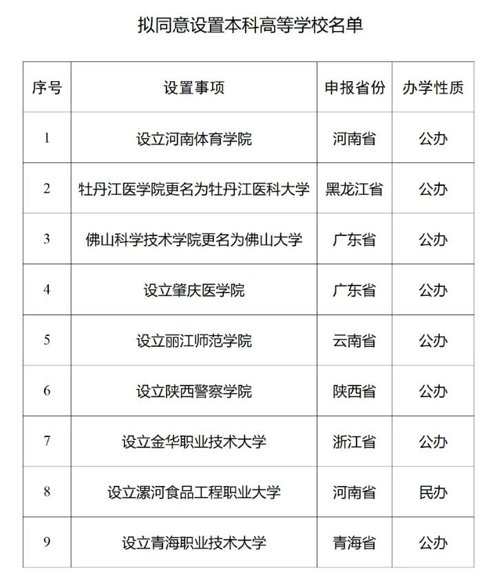 根據(jù)《中華人民共和國(guó)高等教育法》《普通高等學(xué)校設(shè)置暫行條例》《普通本科學(xué)校設(shè)置暫行規(guī)定》《本科層次職業(yè)學(xué)校設(shè)置標(biāo)準(zhǔn)(試行)》等有關(guān)規(guī)定以及第八屆全國(guó)高等學(xué)校設(shè)置評(píng)議委員會(huì)考察評(píng)議結(jié)果,經(jīng)教育部黨組會(huì)議審議,擬同意設(shè)置河南體育學(xué)院等9所學(xué)校,現(xiàn)予公示。其中,2所高校更名,7所高校為新設(shè)。