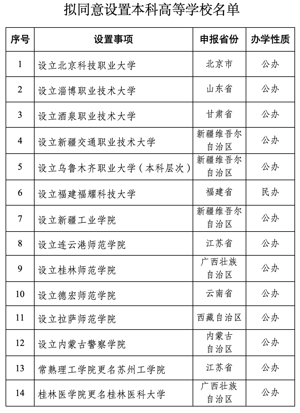 根據(jù)《中華人民共和國高等教育法》《普通高等學(xué)校設(shè)置暫行條例》《普通本科學(xué)校設(shè)置暫行規(guī)定》《本科層次職業(yè)學(xué)校設(shè)置標(biāo)準(zhǔn)(試行)》等有關(guān)規(guī)定以及第八屆全國高等學(xué)校設(shè)置評(píng)議委員會(huì)考察評(píng)議結(jié)果,經(jīng)教育部黨組會(huì)議審議,擬同意設(shè)置北京科技職業(yè)大學(xué)等14所學(xué)校。