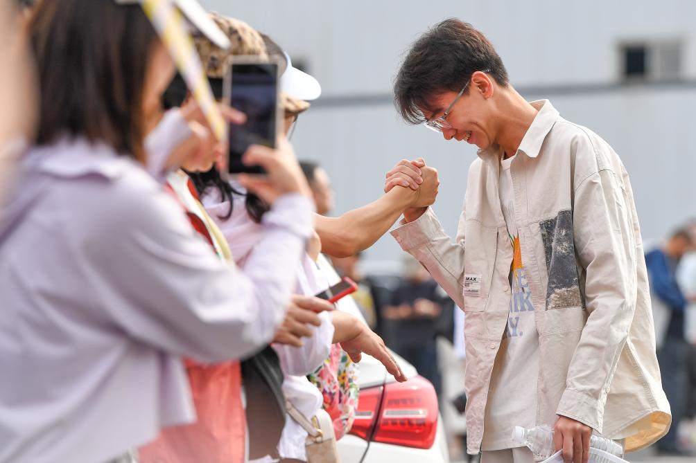 在江蘇省南京市建鄴區(qū)中華中學(xué)考點,考生與送考人偶擊掌(2024年6月7日攝)。新華社記者 李博 攝