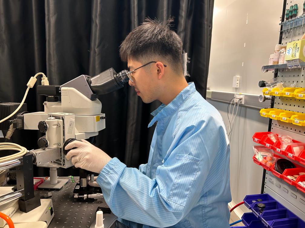 南京大學2020級博士生朱衡天通過顯微鏡檢查射頻器件的微觀結(jié)構(gòu)。(王藝琳 攝)