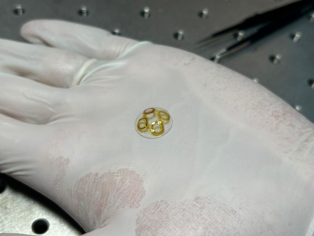 5月17日,記者在南京大學現(xiàn)代工程與應(yīng)用科學學院光電智能感知實驗室看到了這款新型眼動追蹤隱形眼鏡!八褪忻嫔系碾[形眼鏡使用相同的材料。”論文第一作者、南京大學2020級博士生朱衡天介紹,鏡片所用的醫(yī)療級硅橡膠材料厚100微米左右,其上均勻分布著4個金色線圈。