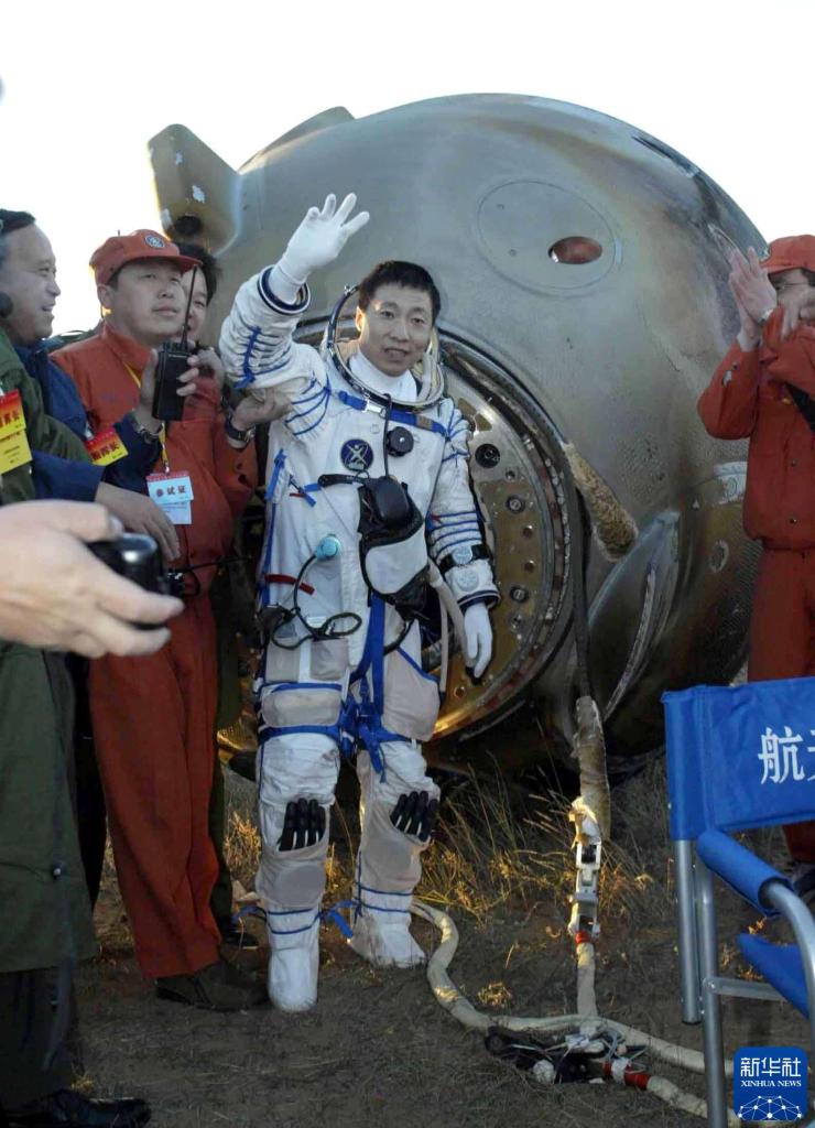 2003年10月16日,神舟五號載人飛船在內(nèi)蒙古主著陸場成功著陸,航天員楊利偉在返回艙艙口向人們揮手致意。